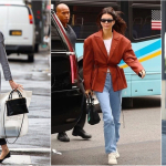 Weaving through her own NYC neigrhood streets, Lawrence cut a cool figure on her electric bike. She wore the Le Fernando faux fur jacket in animal print, La blue, loose leg jean a favorite denim...